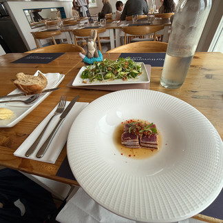 Dinner was at the Portminster Restaurant on the beach. I reserved and specifically asked for a table by the window. I was told they were apportioned by when the reservations were made - if you booked early, you got one. When I arrived I was offered one - in front of an open door. I asked if the door could be shut and was told no, but I could sit on the patio, but that wouldn't be much different because it was also in the open air. Meanwhile someone (the boss?) was closing the window and I was shown to the table. The other idiot made himself scarce quickly while I was walking to the table. Dinner was very tasty, if expensive: burrata gazpacho, salad (for buni), tuna and lemon tart. They had a discretionary 12% tip on the menu which I put down to 10% because of my reception.