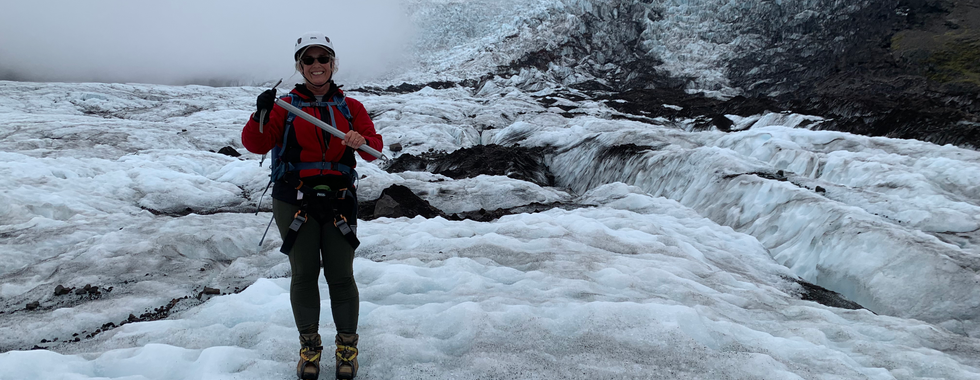 On to the Skaftafell glacier. This are of Iceland has been used for filming of various adventure movies, like the remake of Journey to the Center of the Earth. It does look mysterious, especially on an overcast day like today. At MELRAKKI ADVENTURES I met my glacier guide and tour group. Al were younger than I. We got kitted up with helmet, ice spikes, Ice ax, roping harness, and set off in a 4x4 with huge tires. Off the main road the access road was VERY rough and we drove slowly to the parking area. It was so rough the vehicle had some issues navigating over the rocks which didn't bode well for the return journey.