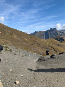 As we get closer to the Grand Col the wind kicks up and we put on most everything we own as we reach the top. This is the border between Switzerland and Italy and where we stop for lunch and the beautiful view. There's also a herd of sheep that comes through. They even walk along the downward trail for a short while before the sheep dogs drive them on and down the valley.