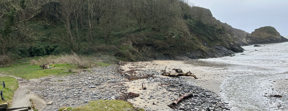 Polridmouth: the building behind the second sandy cove was the inspiration for the beach house in Daphne du Maurier’s novel `Rebecca'. Du Maurier lived further up the valley in the Elizabethan house called Menabilly Barton and this is her mysterious ‘Manderley’.
