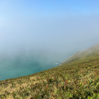 This was the beginning to the long final uphill to a ridge. There were low clouds and mist which affected the views, but you could see wild ponies on the ridge at the top. From the top there was a sheer drop to the ocean and rocks. One of these was St Roberts Chair which I never did see.