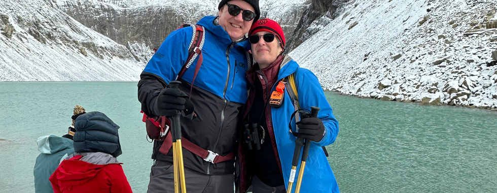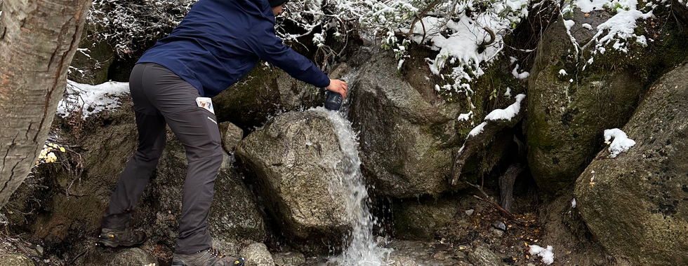 The next phase of the hike was through a forest section along a river. The elevation gain was less here, but still present. This was magical because the snow covered the trees with changing leaves and it looked like a fairyland. Occasionally, the snow would fall off the branches in a big plop as we walked underneath. The guide filled the water bottle using glacial water. We crossed the river and several rivers to the next stopping point - the base of the morraine - which was about 1.5 miles later.